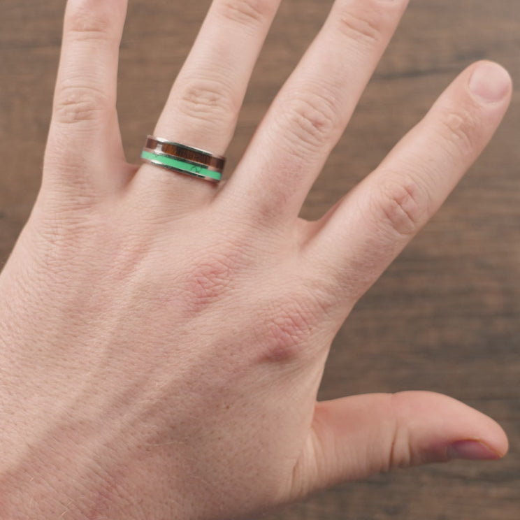 This wood ring blends sand pear wood with beautiful turquoise and metal for a unique piece of jewelry that will be the envy of all of your friends. If you have been searching for a truly unique piece of men's jewelry, look no further than this fabulous ring.