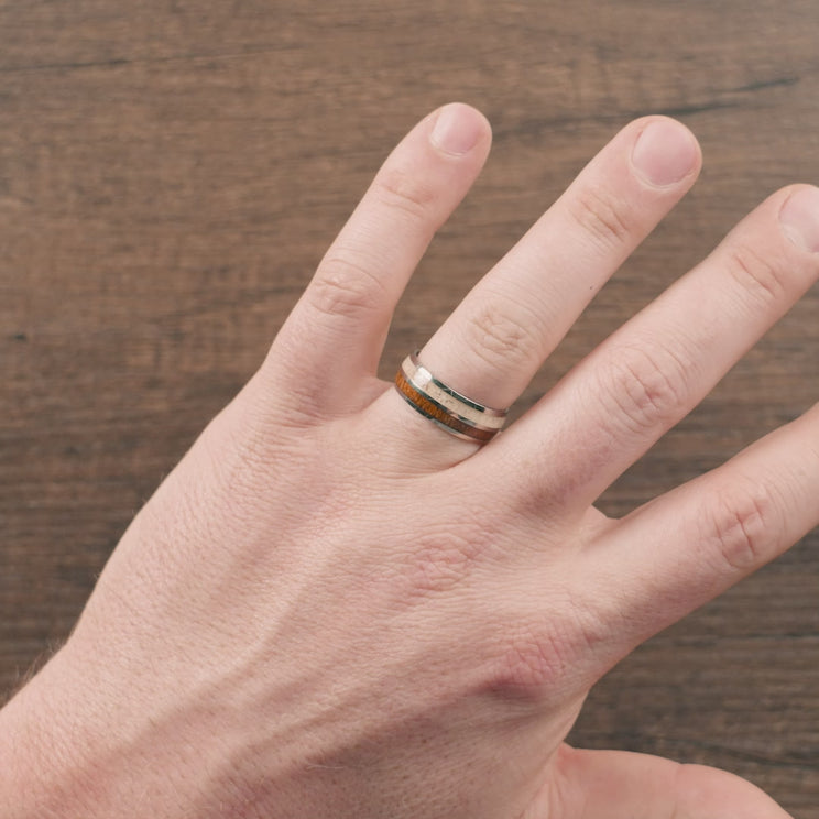 A stunning adjoining between the natural world and modern style, this handcrafted titanium ring features twin strips of koa wood and real deer antler.