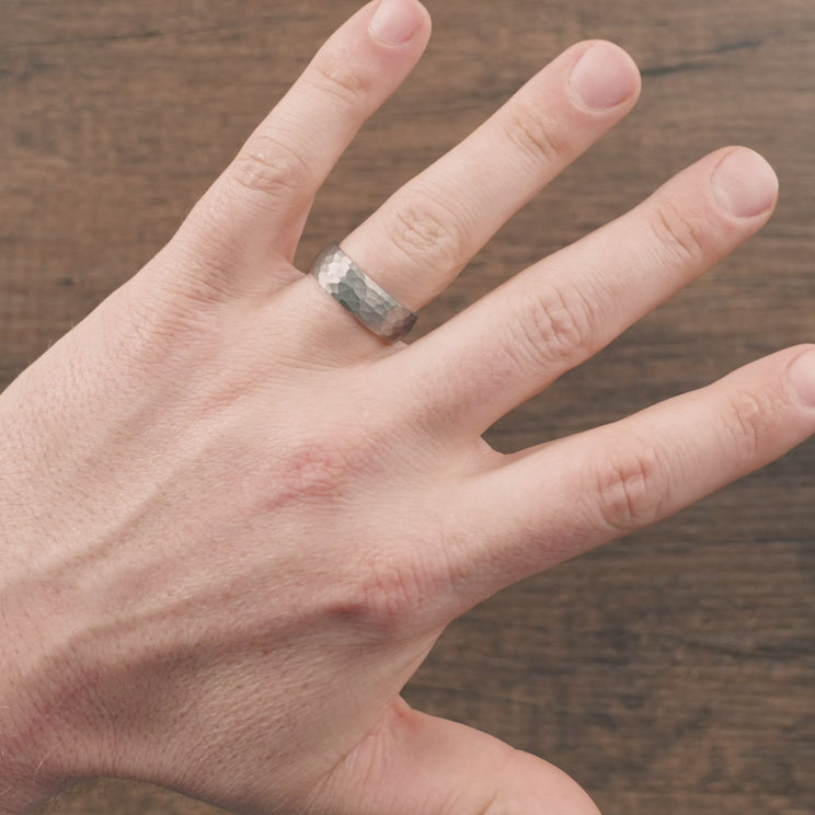 The hammered and brushed finish is evidence of the care taken with this small batch crafted ring. It's also beautiful in its masculinity, subtle sheen and clean lines. For the independent spirit, this is an unfussy wedding band that can handle a special occasion, but is comfortable enough for everyday living.