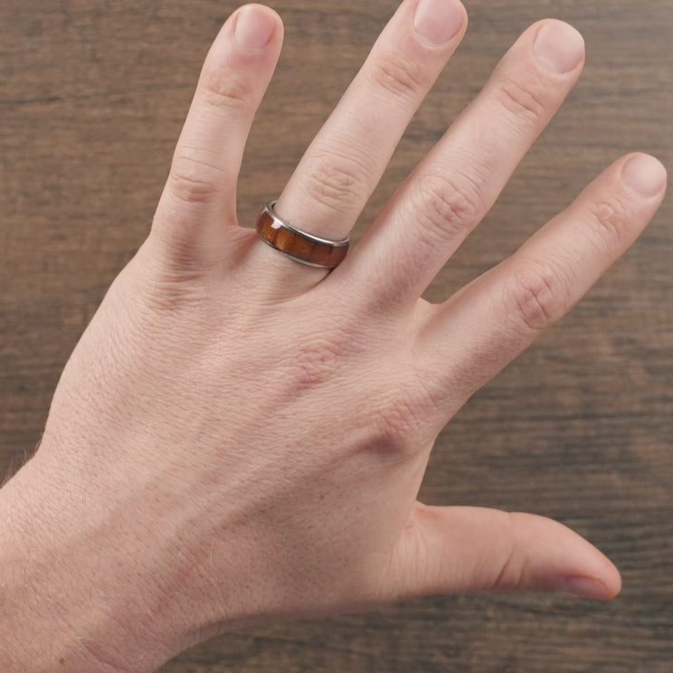 An example of modern, laid-back style, this domed chestnut ring encircles a band of solid tungsten, full of personality and handcrafted with care.