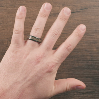 Presenting The 5.56, a men's wedding band with a powerful blend of military heritage and timeless elegance. Crafted with genuine brass shell casings from 5.56 round used in the esteemed M-16 rifle, this ring exudes courage and strength.