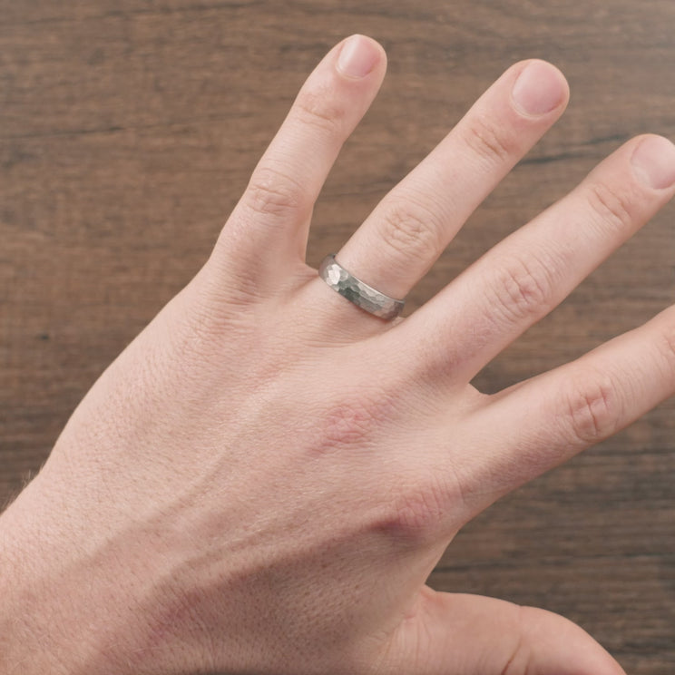 The hammered and brushed finish is evidence of the care taken with this small batch crafted ring. It's also beautiful in its masculinity, subtle sheen and clean lines. For the independent spirit, this is an unfussy wedding band that can handle a special occasion, but is comfortable enough for everyday living.
